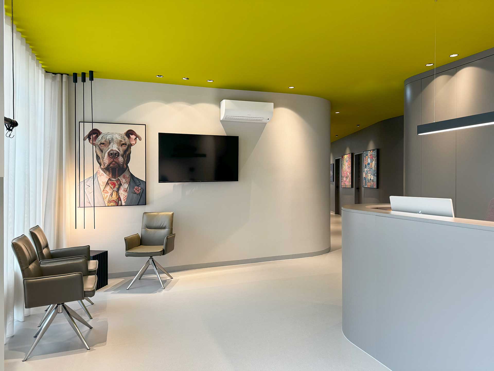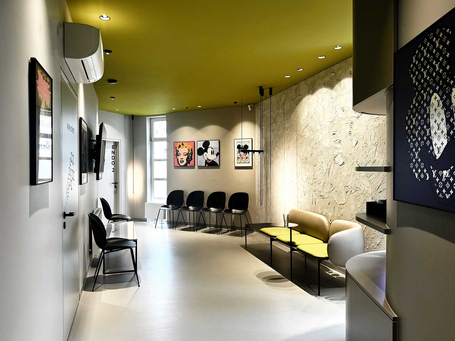 Planung und Architektur für die Chirurgie Hernals, geplant von Architekt GRAF, helles, modernes Ambiente, Pop art Elemente an der Wand, gelbe und schwarze Akzente im Raum.